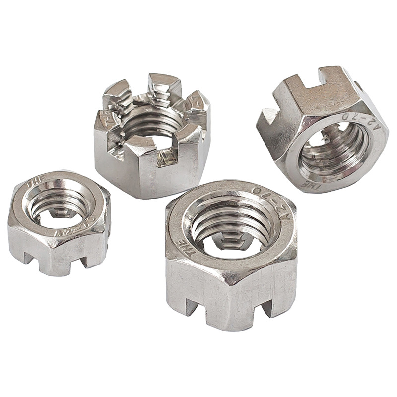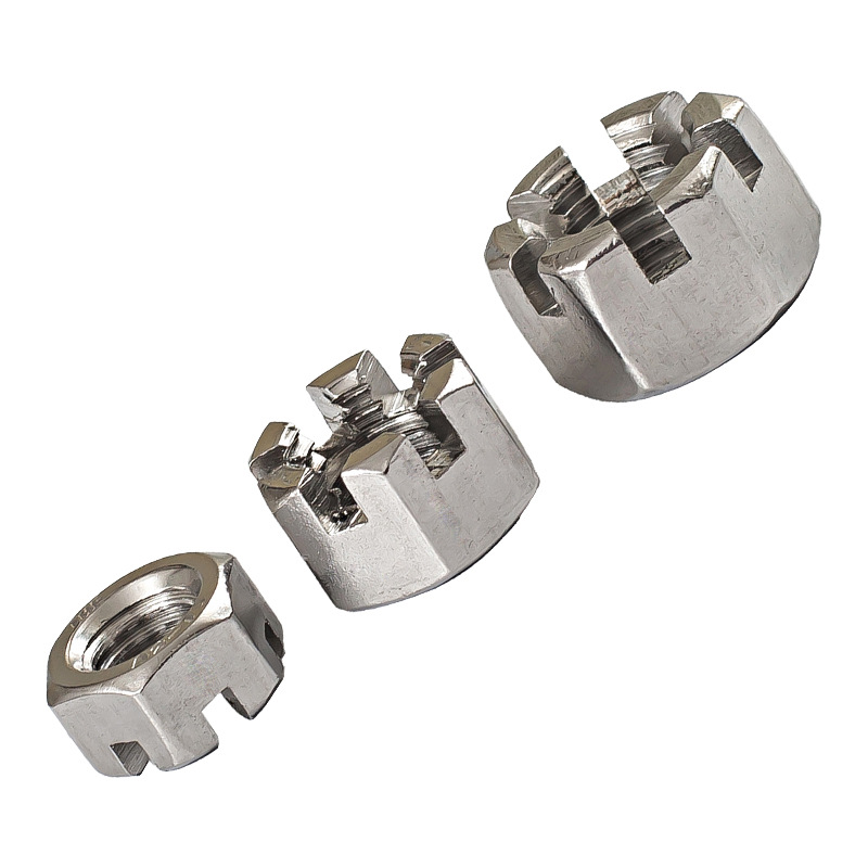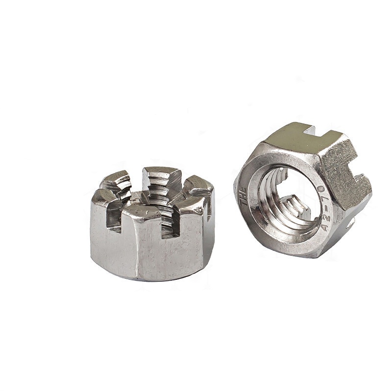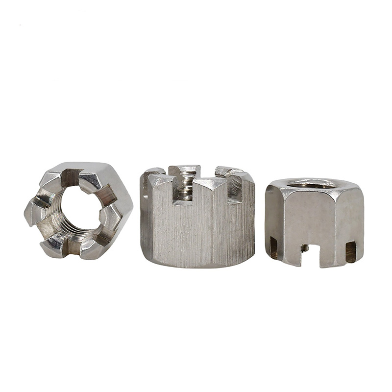 రస్ట్ మరియు తుప్పు నుండి మరింత మెరుగైన రక్షణ కోసం, స్లాట్ చేసిన స్లాట్లతో కూడిన స్లాట్లతో కూడిన సురక్షితమైన కిరీటం గింజ వివిధ రకాల లక్ష్య ఉపరితల చికిత్సలతో లభిస్తుంది: హాట్-డిప్ గాల్వనైజింగ్ బలమైన తుప్పు రక్షణ కోసం మందమైన జింక్ పొరను జోడిస్తుంది. కాడ్మియం ప్లేటింగ్ ఏరోస్పేస్లో విస్తృతంగా ఉపయోగించబడుతున్నప్పటికీ, దీని ఉపయోగం కొన్ని దృశ్యాలలో లేదా కొన్ని ప్రమాణాలలో పరిమితం చేయబడింది. వివిధ పరిసరాల యొక్క తుప్పు రక్షణ అవసరాలకు అనుగుణంగా జియోమెట్ మరియు డాక్రోమెట్ వంటి ప్రత్యేక పూతలు కూడా అందుబాటులో ఉన్నాయి. ఈ చికిత్సల ద్వారా, అవి ఎక్కువ కాలం మంచి పరిస్థితిని కొనసాగించగలవు మరియు తుప్పు ఒక ప్రముఖ సమస్య (తేమ మరియు ఉప్పగా ఉండే సముద్ర వాతావరణాలు మరియు రసాయనాలతో తరచూ సంబంధాలు కలిగి ఉన్న ఫ్యాక్టరీ ప్రాంతాలు వంటివి) ఉన్న దృశ్యాలలో తుప్పు ద్వారా దెబ్బతినే అవకాశం తక్కువ. స్టెయిన్లెస్ స్టీల్ స్లాట్డ్ క్రౌన్ గింజల కోసం, నిష్క్రియాత్మకత ప్రామాణికం. ఆ ప్రక్రియ ఉచిత ఇనుమును తొలగిస్తుంది మరియు రక్షిత ఆక్సైడ్ పొరను ఏర్పరుస్తుంది, ఇది తుప్పును నిరోధించే వారి సహజ సామర్థ్యాన్ని ఎక్కువగా చేస్తుంది.