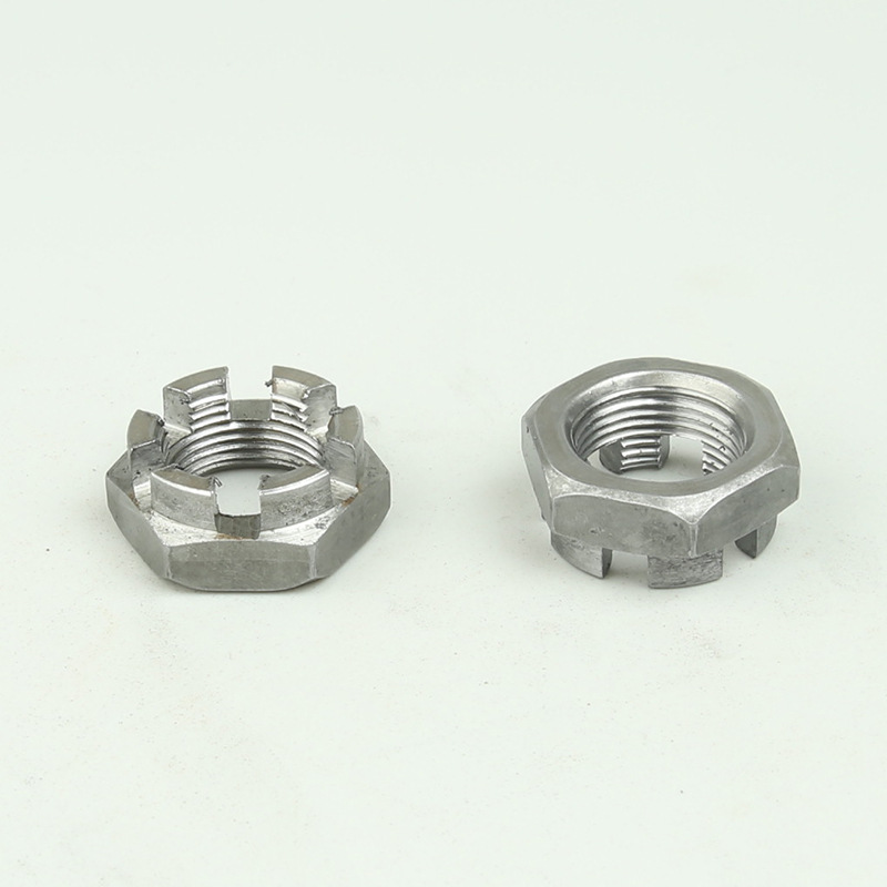 స్లాట్తో ఈ రకమైన వినూత్నంగా రూపొందించిన కిరీటం గింజ సాధారణంగా సాధారణ కార్బన్ స్టీల్ లేదా స్టెయిన్లెస్ స్టీల్ వంటి సహజ లోహ ఉపరితల చికిత్స ప్రభావాన్ని కలిగి ఉంటుంది.