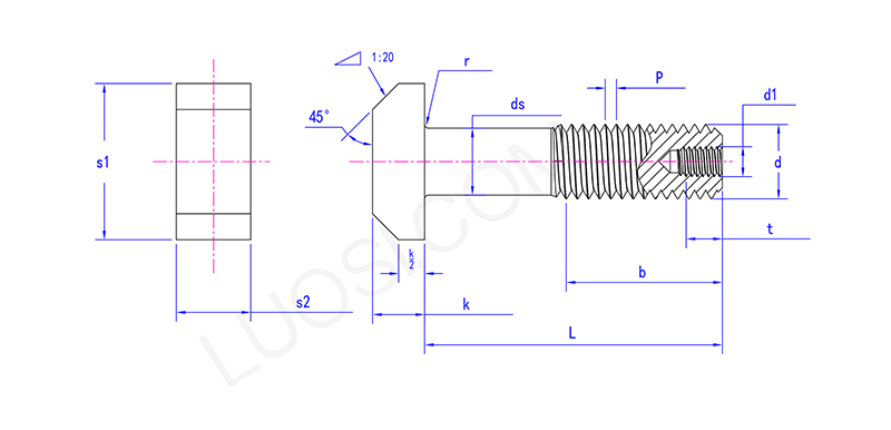 రంధ్రంతో తగ్గిన షాంక్ టి బోల్ట్ యొక్క తల రోంబస్ మాదిరిగానే ఉంటుంది మరియు పరిష్కరించడానికి టి-స్లాట్లో చిక్కుకోవచ్చు మరియు తిప్పబడదు. దాని స్క్రూ యొక్క మధ్య భాగం సన్నగా మారింది, అనగా "కుంచించుకుపోయిన రాడ్", మరియు స్క్రూ దిగువన ఒక రంధ్రం కూడా రంధ్రం చేయబడింది. లోపలి భాగం బోలు.