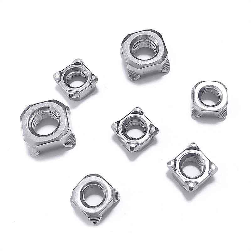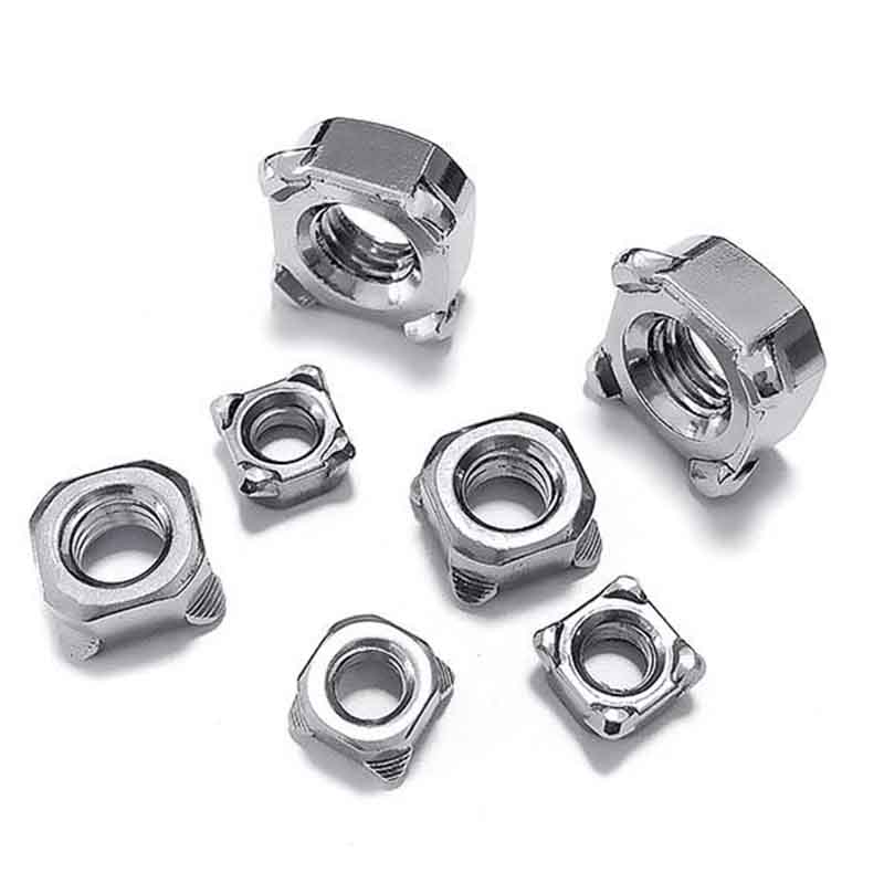 టైప్ B స్క్వేర్ వెల్డ్ గింజలు మొత్తం చతురస్రాకారంలో ఉంటాయి. అవి మధ్యలో థ్రెడ్ రంధ్రాలను కలిగి ఉంటాయి మరియు నాలుగు మూలల్లో ప్రతి ఒక్కటి చిన్న ప్రోట్రూషన్ను కలిగి ఉంటాయి, ఇది ప్రత్యేకంగా వెల్డింగ్ ప్రయోజనాల కోసం రూపొందించబడింది. M4 నుండి M12 వరకు, అన్నీ అందుబాటులో ఉన్నాయి మరియు సంబంధిత బోల్ట్లు కూడా అందించబడతాయి.